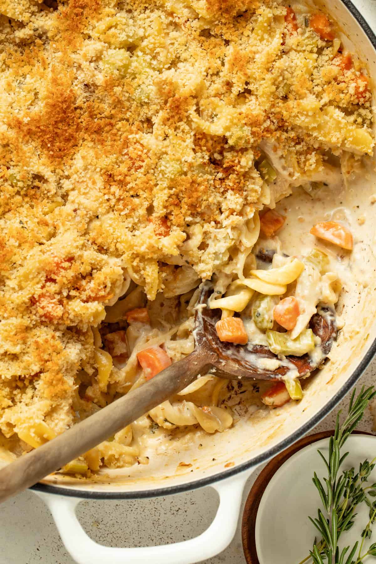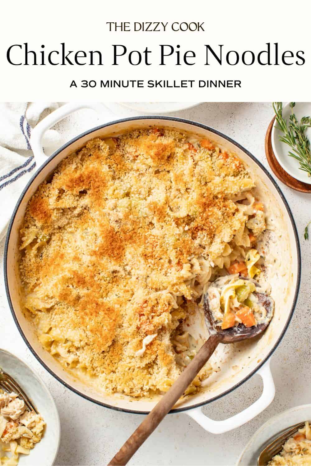 This chicken pot pie noodles is the ultimate comfort food! All the flavors of a classic chicken pot pie, but with added noodles and a crunchy panko topping, cooked in one cast iron skillet. A cozy 30 minute meal the whole family will love!