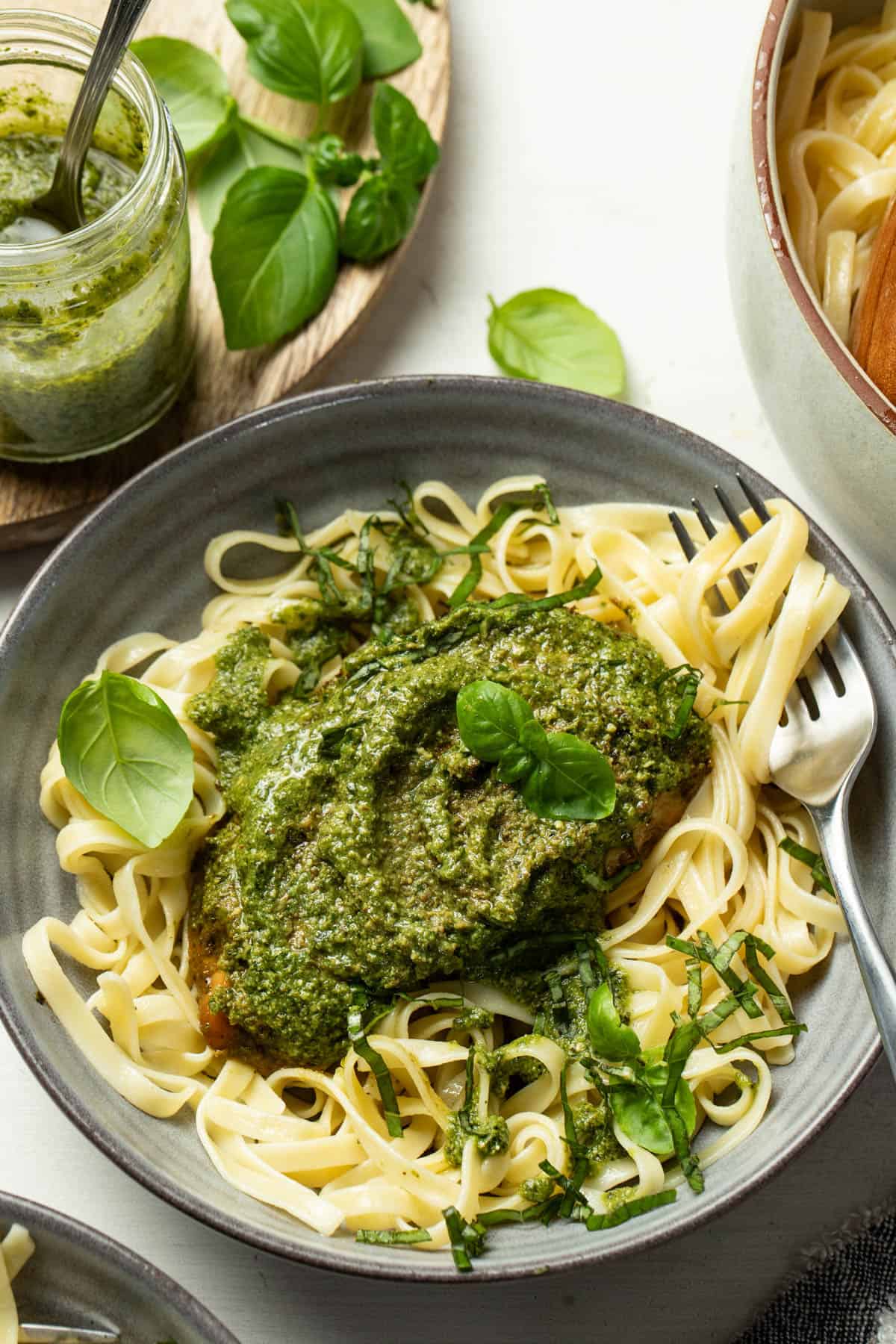 Step 4: Add about 1/2 cup of pesto to the top of the chicken to brighten the green color and add more flavor! Top with fresh basil, if desired.