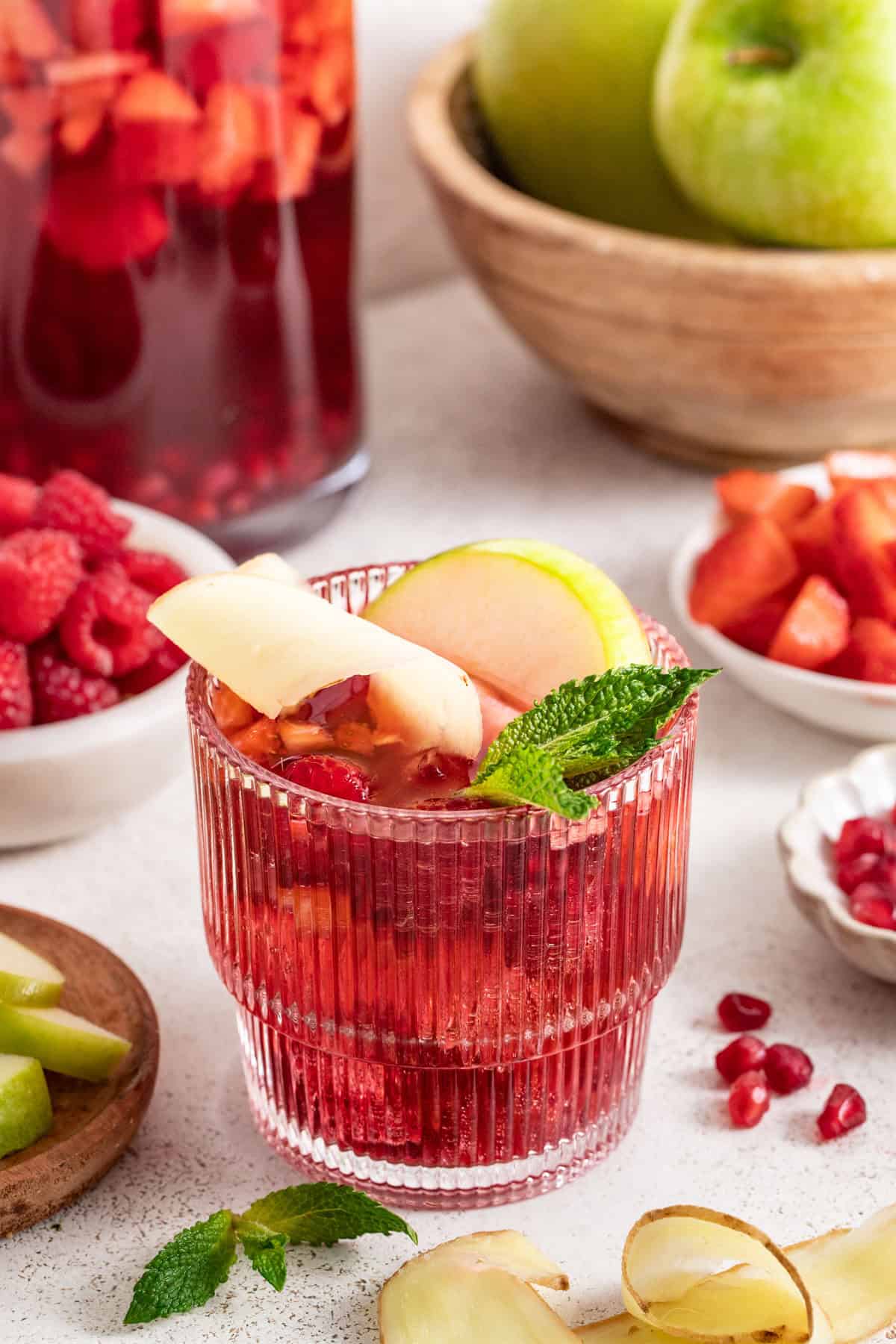 - Step 4: Fill a glass 1/3 of the way with ice, then add a round slice of green apple to the side of a glass. Pour the sangria into the glass 3/4 of the way full, then top with sparkling water. Garnish with a long slice of ginger, a sprig of mint, and a few pomegranate seeds. Cheers!
