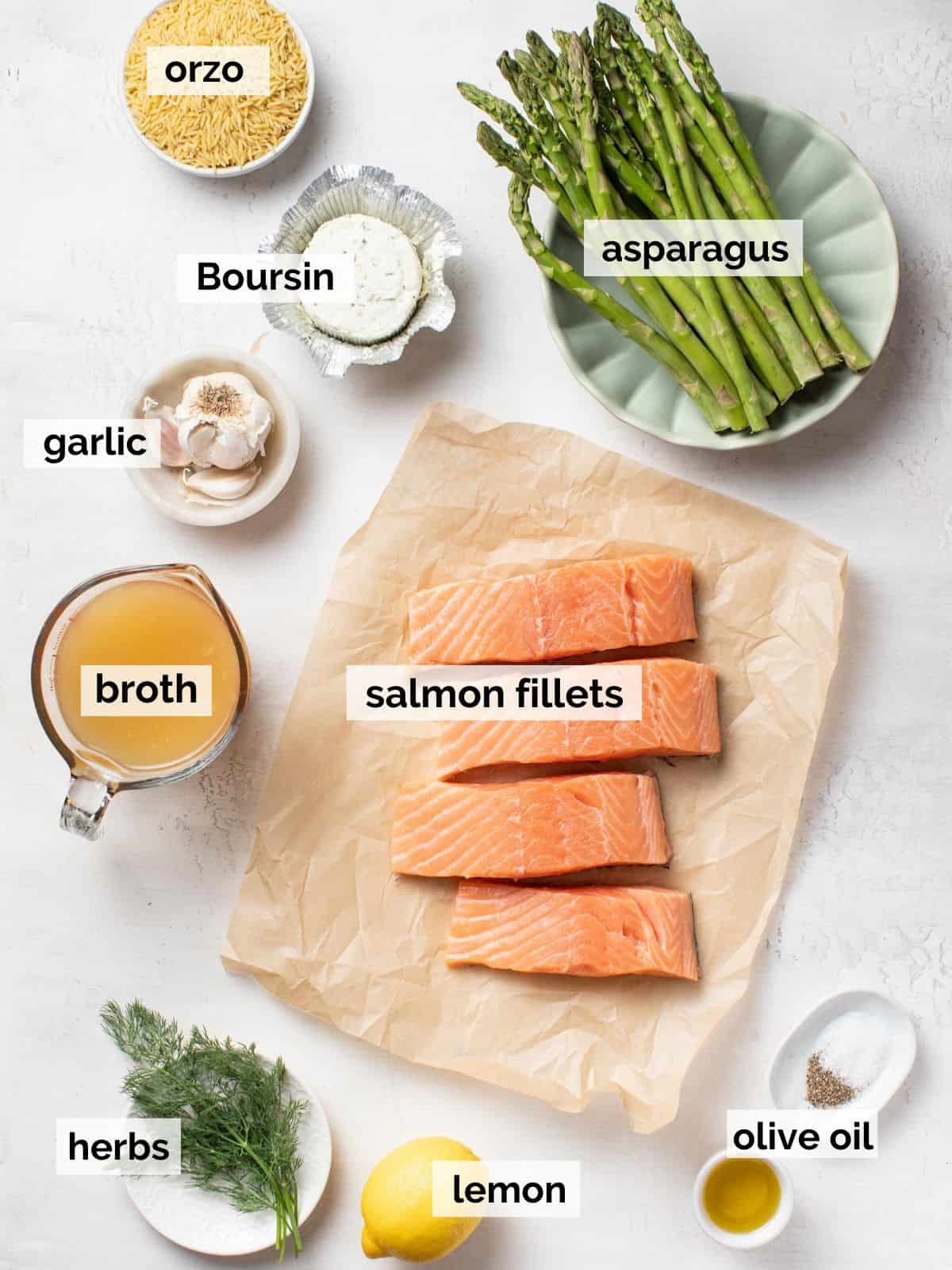 - Main ingredients: Salmon, orzo, asparagus, Boursin cheese, lemon, and broth.