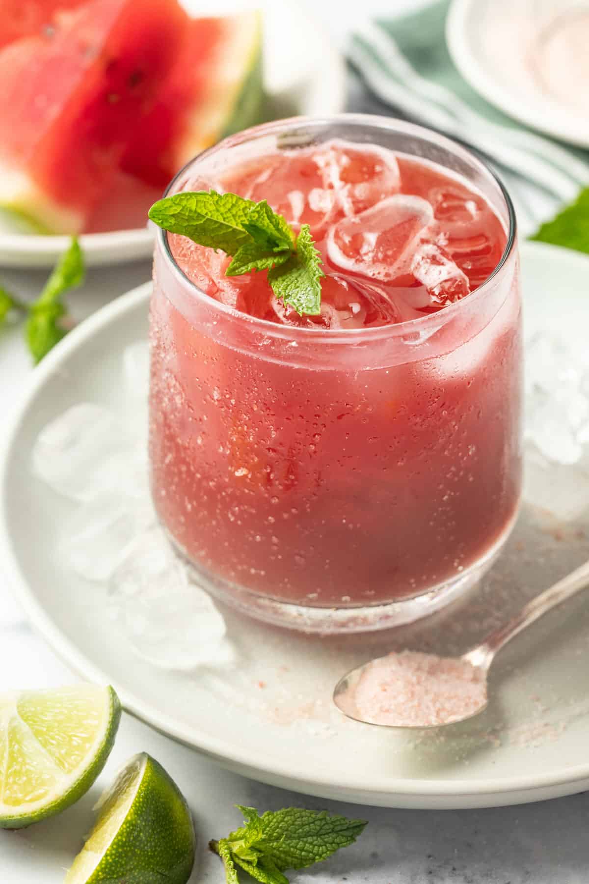 - Mineral salt – Redmond’s is what I use in my electrolyte drinks. This not only perfect for balancing the sweetness with the watermelon, but also contains trace minerals like iron, potassium, and zinc.